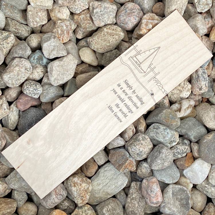 From knots to flowers to a church steeple – Wooden Bookmarks offers an eclectic array of images etched onto super-thin 1/32″ Baltic Birch that won’t damage book bindings. This bookmark features the quote: “Simply by sailing in a new direction you could enlarge the world” – Allen Curnow. Made in the USA.