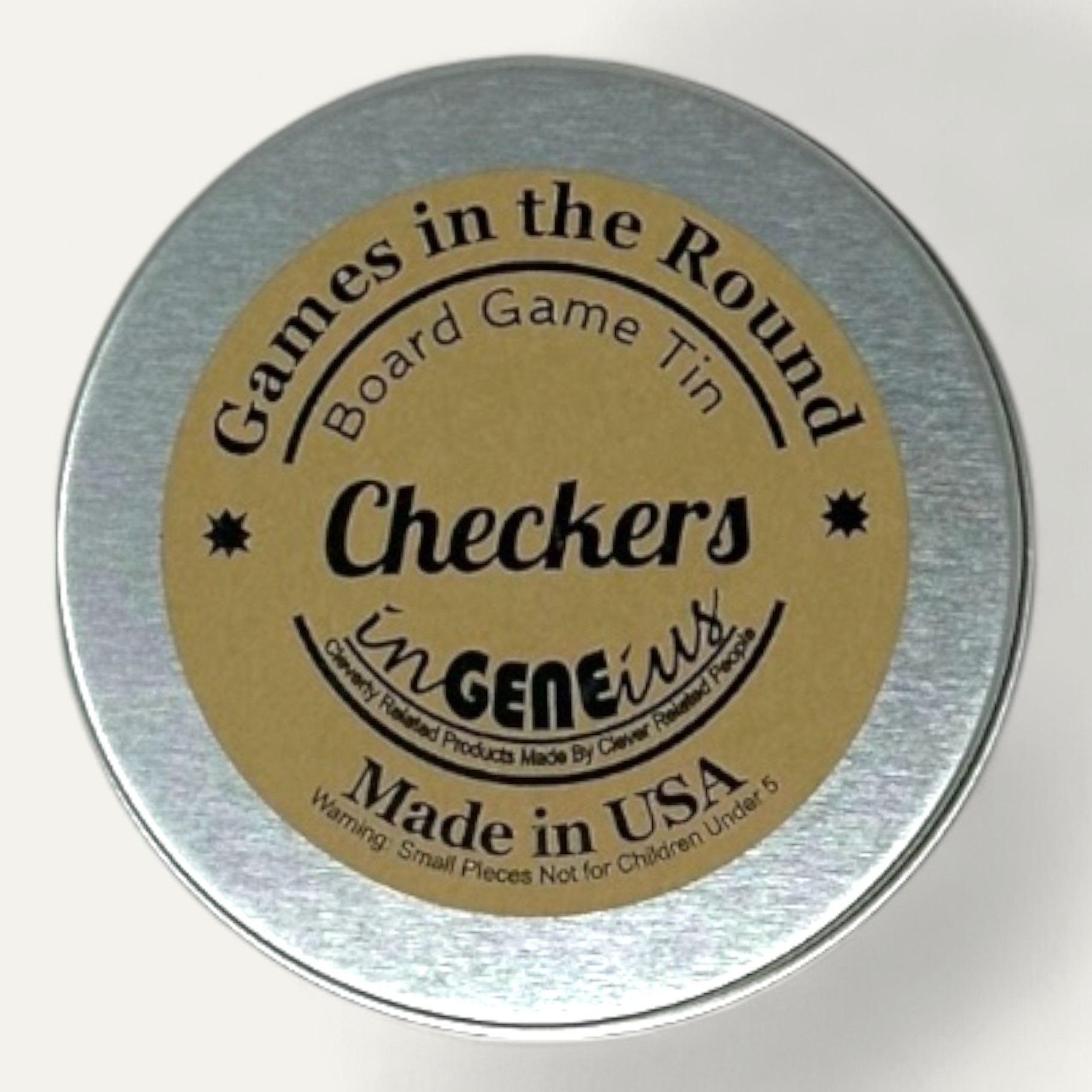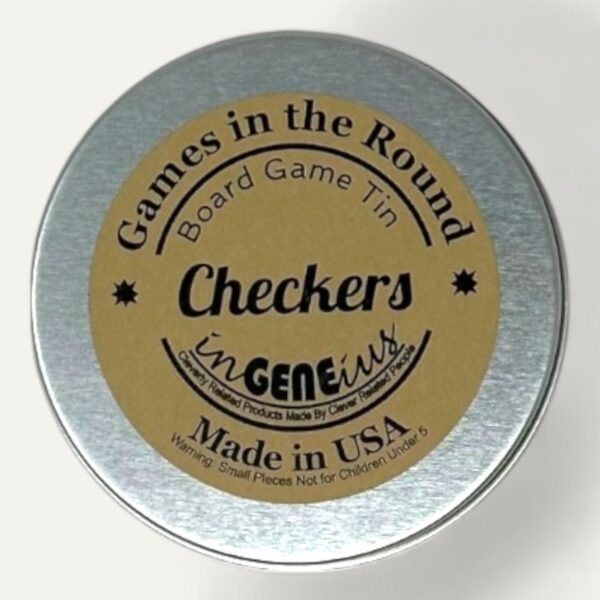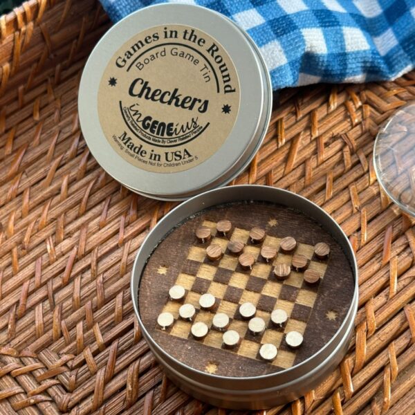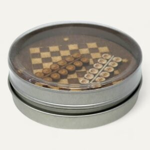 Play a full game of checkers at a tiny scale! Includes all 24 pieces needed for a full game of Checkers. Pieces have a crown engraved on one side. These compact little 3.25in diameter metal tins fit nicely in a pocket, purse, or picnic basket for some out-and-about fun or make a gentle statement on the coffee table next to the remote – let’s turn off the TV and play a game. Games in the Round Checkers is made from sustainably harvested birch and we manufacture them in Bristol, RI.