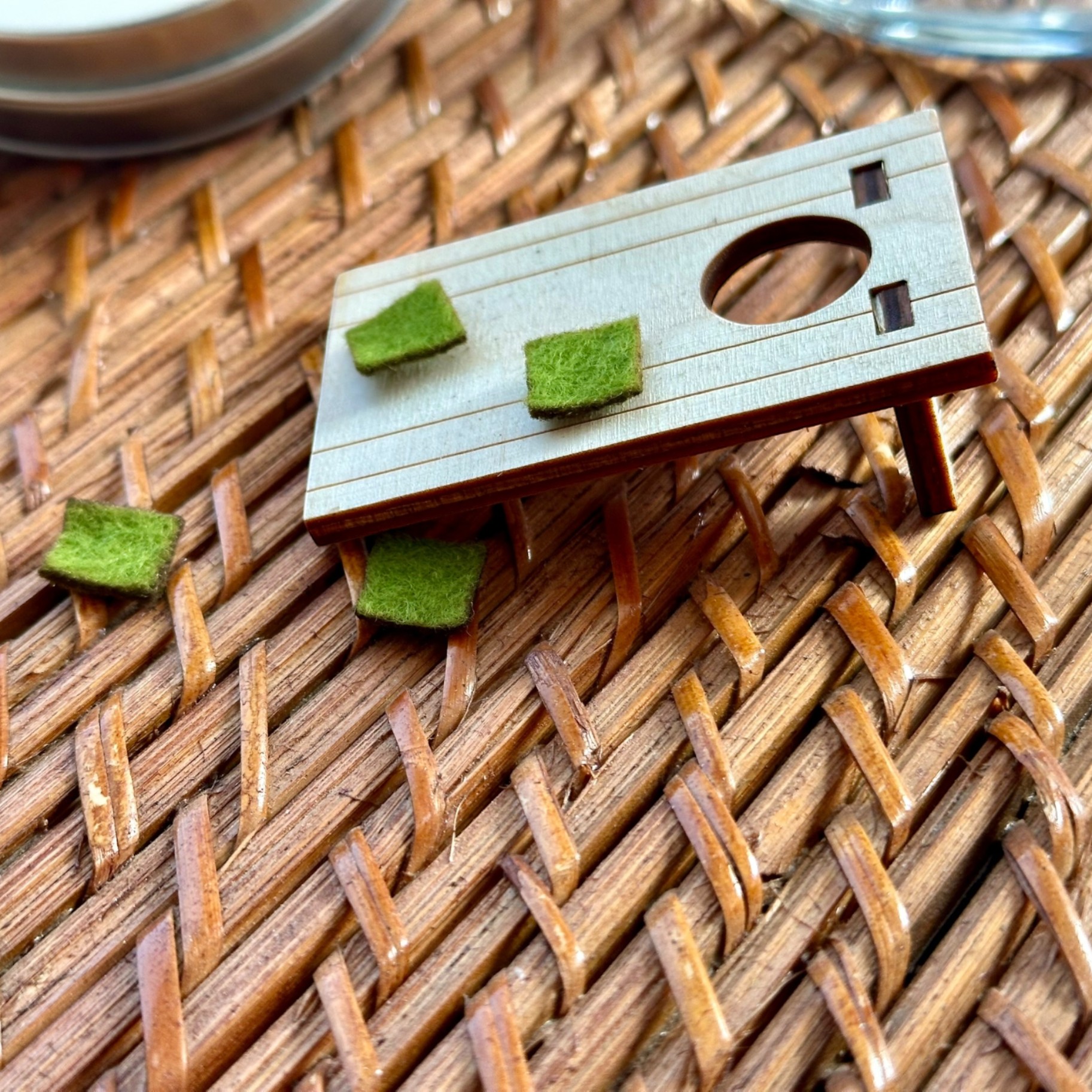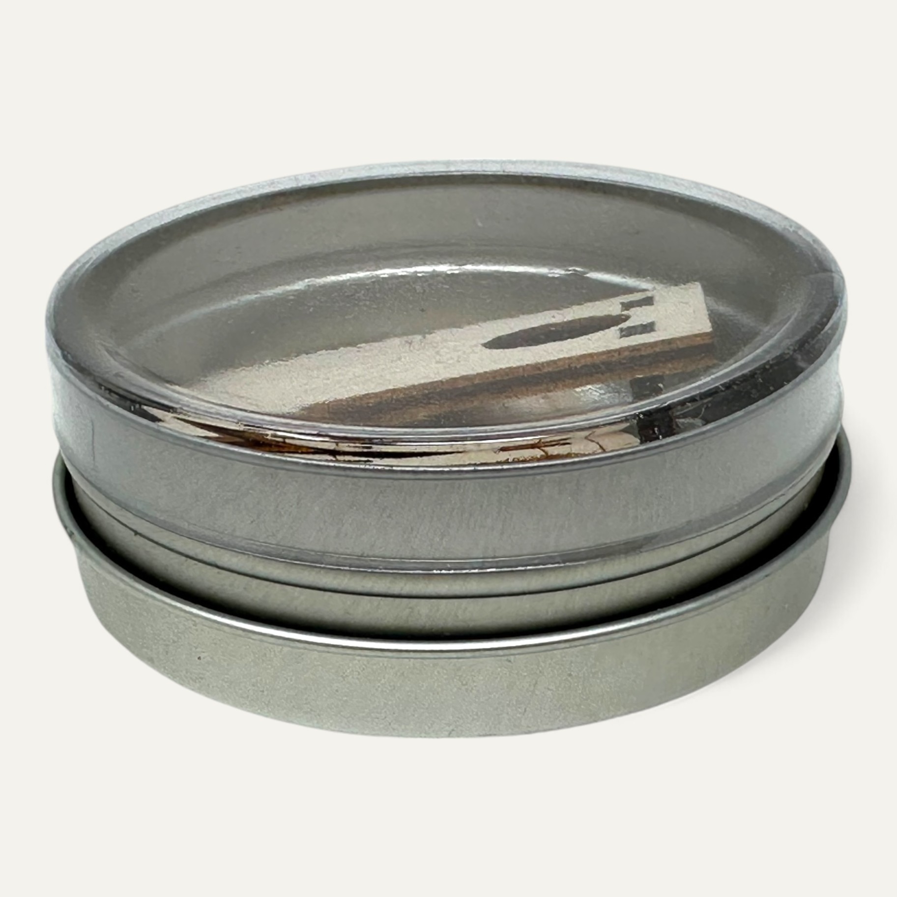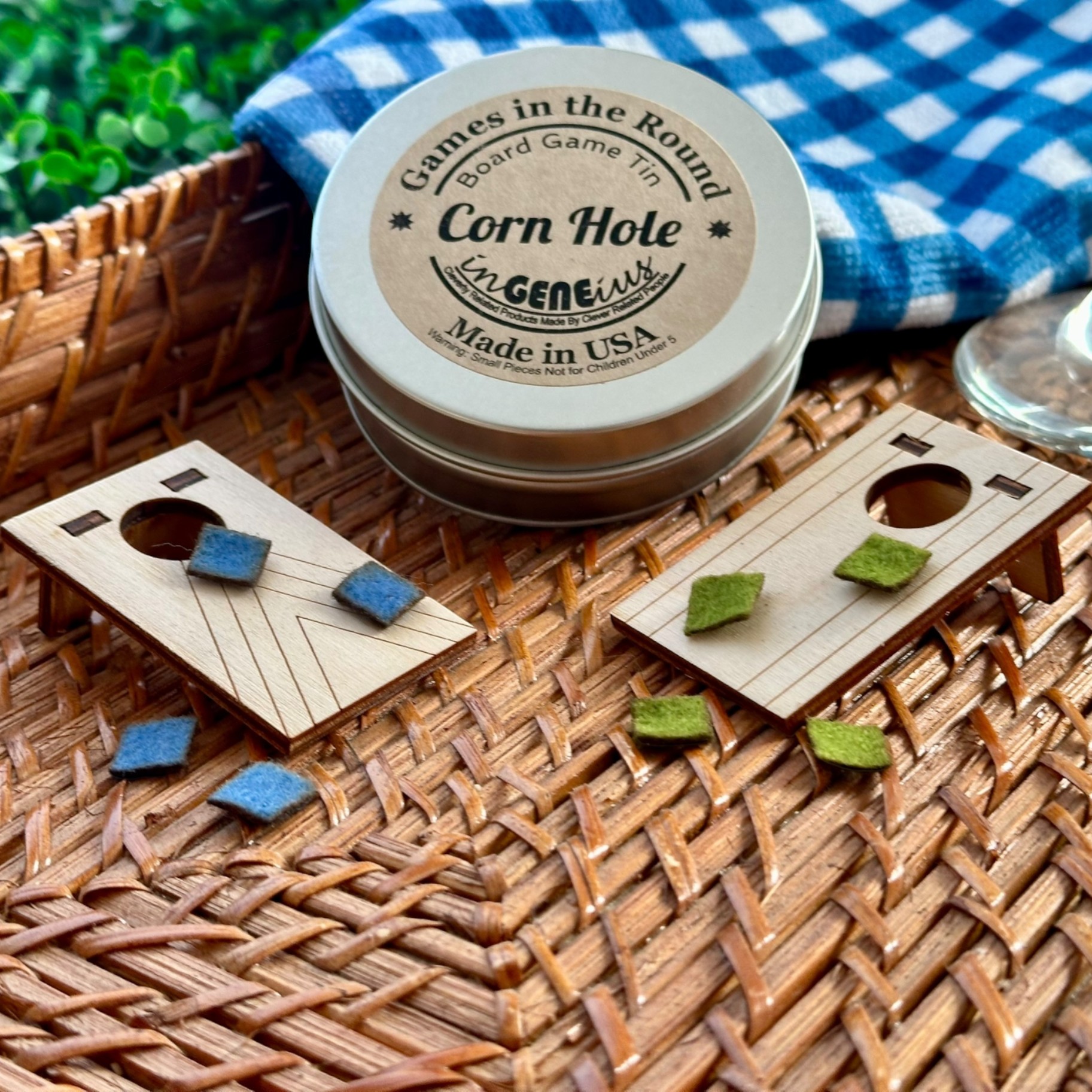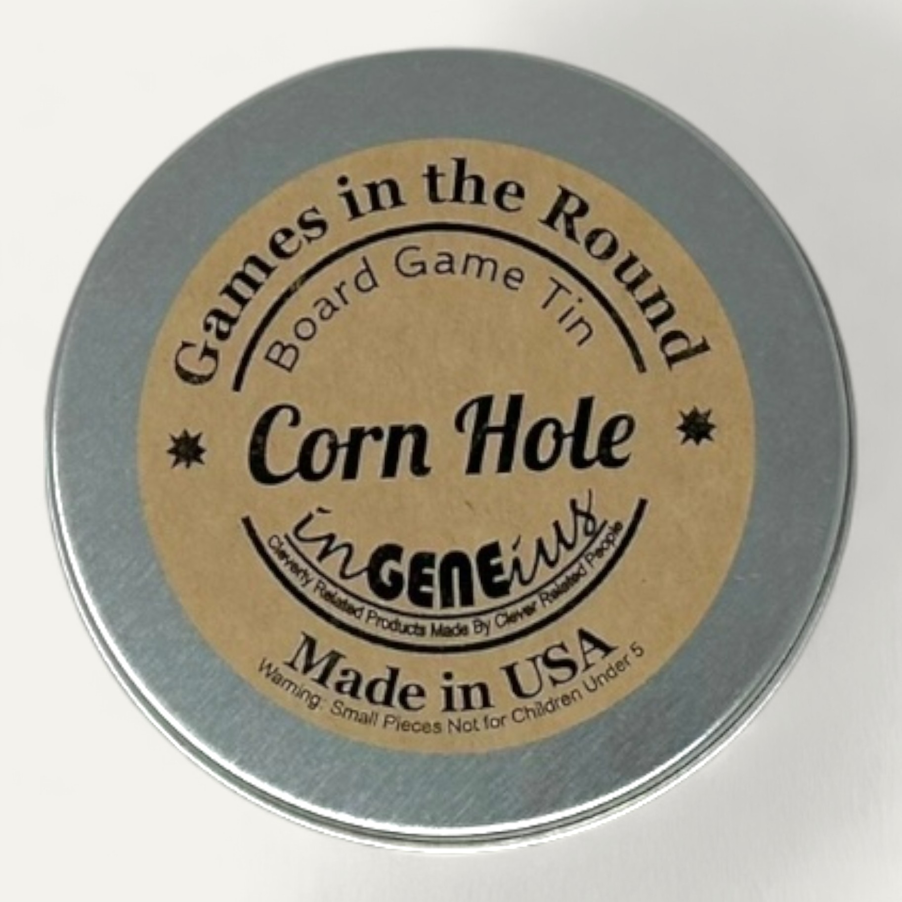 Challenge your friends to miniature cornhole! These adorable desk ornaments are too much fun to pick up and hone your skill while at work, or on the move. Includes two boards and eight felt ‘bags’. These compact little 3.25in diameter metal tins fit nicely in a pocket, purse, or picnic basket for some out-and-about fun or make a gentle statement on the coffee table next to the remote – let’s turn off the TV and play a game. Games in the Round Corn Hole is made from sustainably harvested birch and we manufacture them in Bristol, RI.