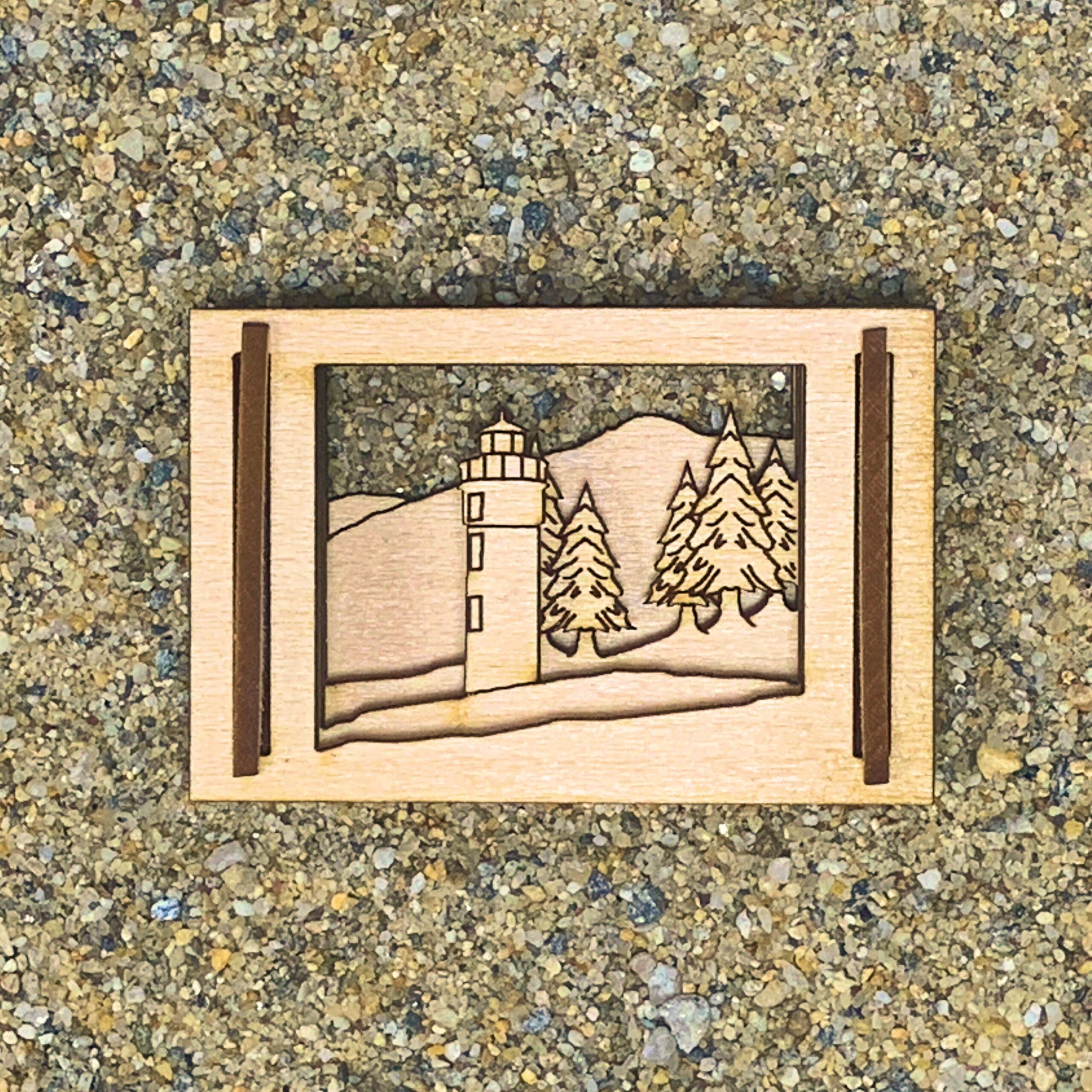 Nestled high up on a bluff this coastal lighthouse could be anywhere from Southport, ME to Seattle, WA. Use the custom Name Drop feature to make this a scene of your area for no additional charge.